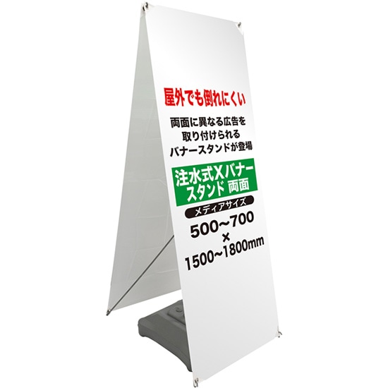 屋内用バナースタンドではできなかった、屋外設置ができるスタンド付きのバナースタンドとなります。バナーを表/裏でとりつけられるから、前後どちらからでもアピールはが可能です!