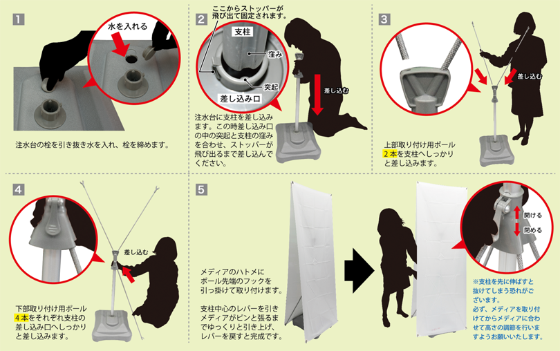 5.メディアのハトメにポール先端のフックを引っ掛けて取り付けます。支柱の中心のレバーを引きメディアがピンと張るまでひっくりと引き上げ、レバーを戻すと完成します。