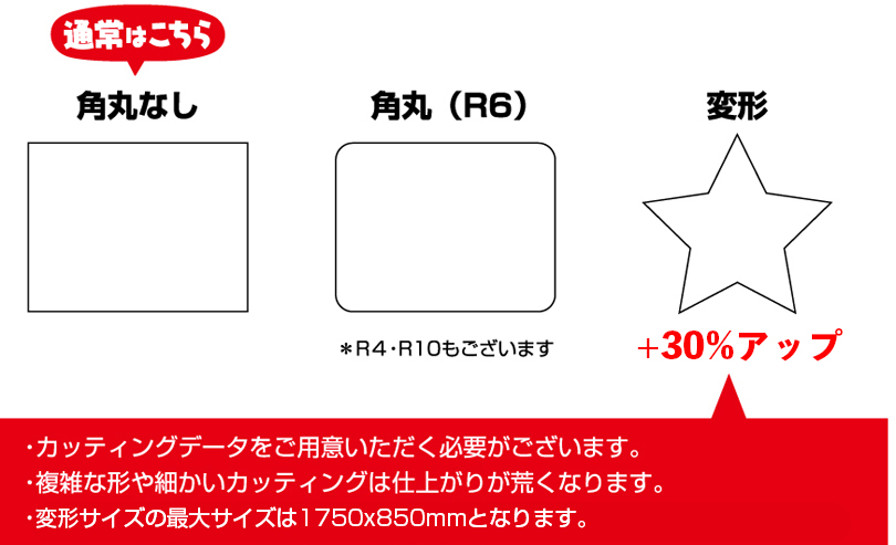 | 定型サイズ | 1枚〜 | 2枚〜 | 5枚〜 | 10枚〜 | オプション 穴あけ |