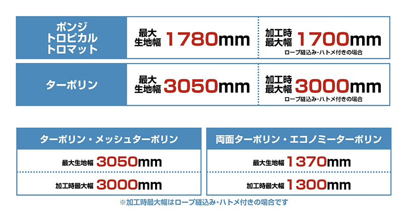 各種生地には最大幅があります。最大幅を超えた横断幕の製作をご希望の場合は二枚繋ぎの特殊商品扱いとなります。まずお見積もりをご請求ください。